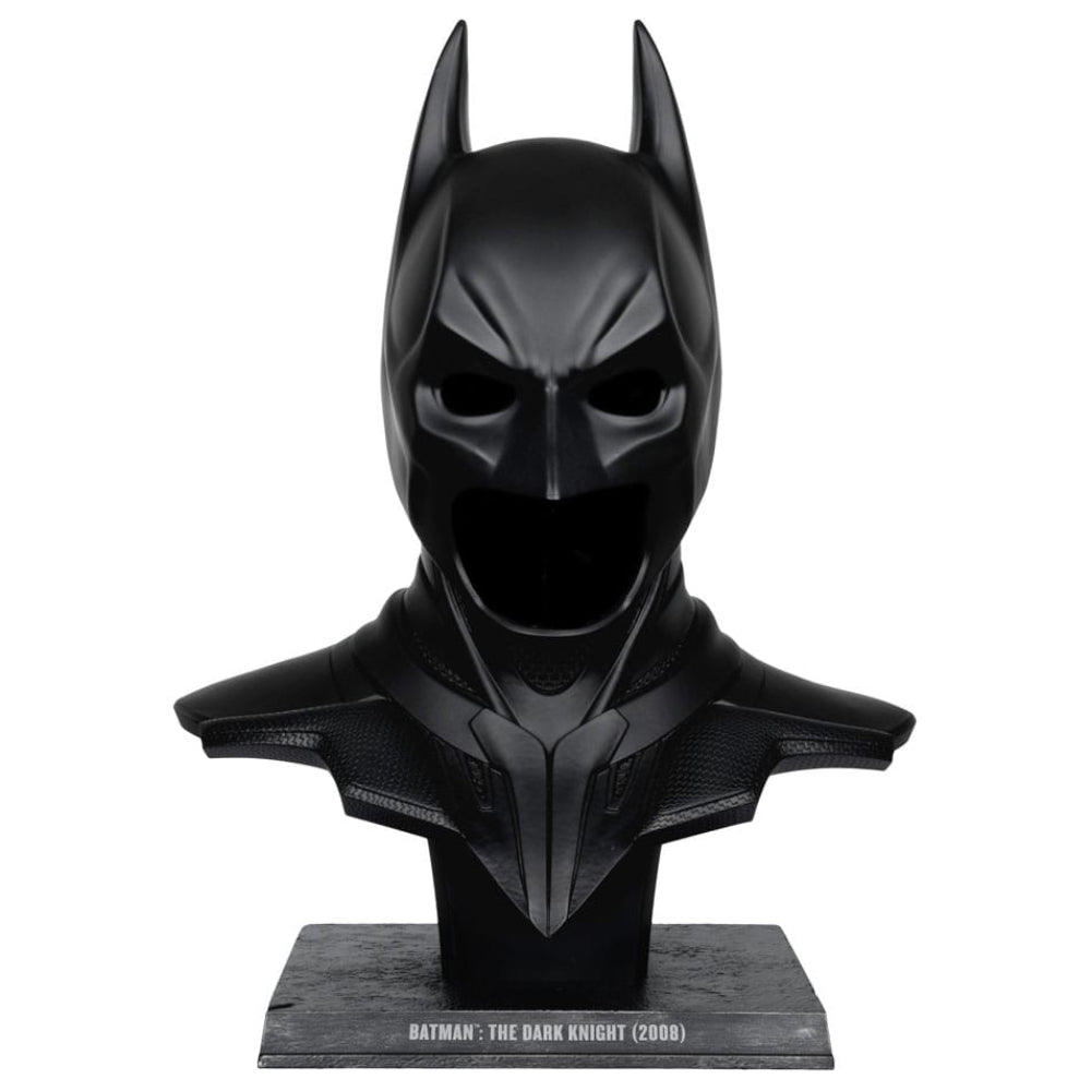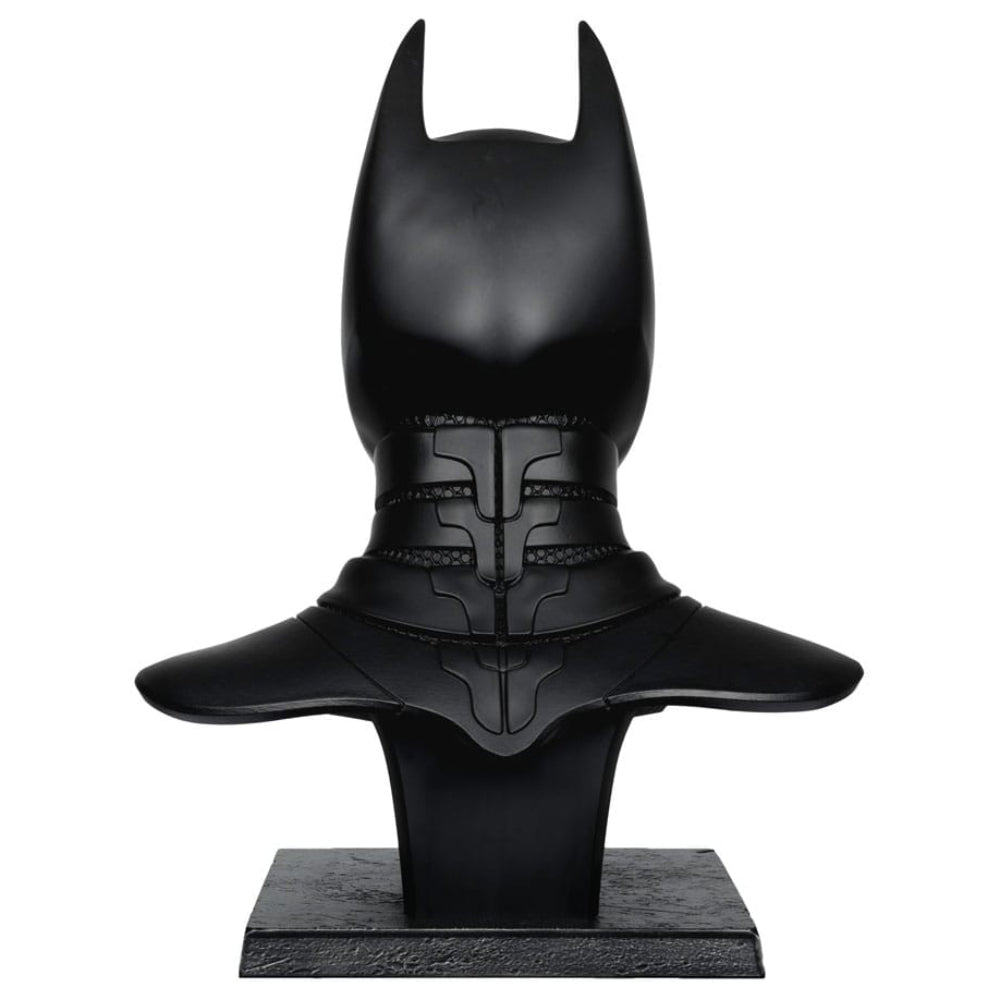 Questa replica in scala 1:1 della maschera di Batman, così come apparso nella trilogia cinematografica di Christopher Nolan "The Dark Knight", è stata prodotta da McFarlane Toys. Il modello con il piedistallo è alto circa 54 cm.