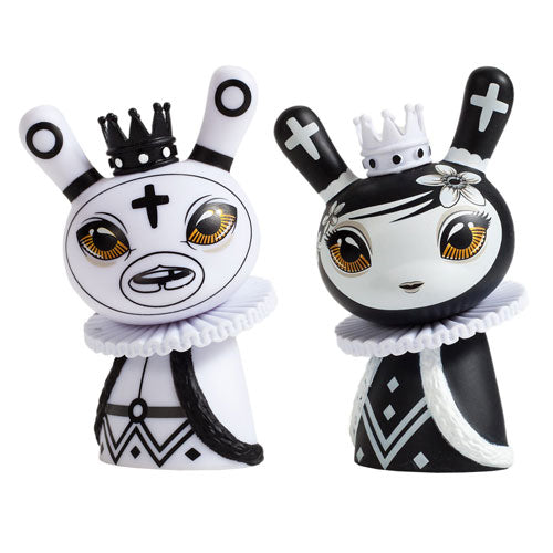 The Shah Mat Dunny series was inspired by chess pieces. It includes 6 designs (king, queen, bishop, knight, rook and pawn) created by Otto Bjornik. All are available in either black or white. Each 2-pack includes one pawn, one surprise piece and four chessboard squares.
